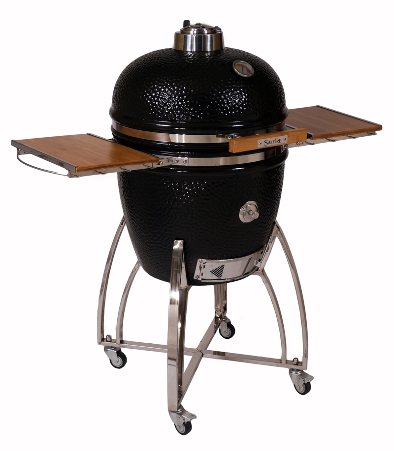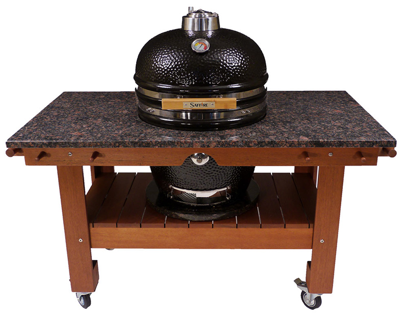 The Saffire charcoal fired, ceramic grill and smoker has the most advanced features in its class. With precision flame control the Saffire Grill can produce delicious gourmet results every time. Whether you're a championship barbecue competitor or simply a novice smoking enthusiast, the Saffire Grill will provide some of the most exceptional results possible on any barbecue smoker available today. The tight seal and heavy ceramic construction of Saffire holds and controls heat like no other type of grill can. Your charcoal usage will be 1/2 to 1/4 that of standard charcoal grills. Whether it's intense heat you require for perfectly seared steaks and seafood, or the savor of true slow smoked barbecue, the Saffire Grill is for you. You can even use it as a wood-fired brick oven for pizza, bread and much more. The high temperature ceramics will give you a lifetime of use. With some of the finest stainless steel alloys on all hardware, you are ensured many years of corrosion resistance and a minimum amount of maintenance. All this comes in a beautiful compact design.
